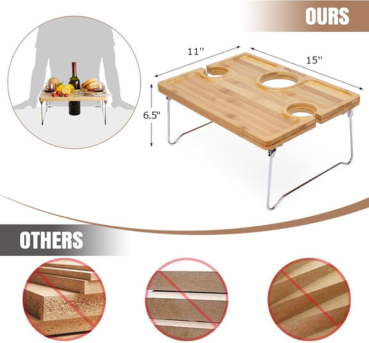 Folding Bamboo Wine Picnic Table with Bottle Opener – Portable Cheese & Snack Tray with Wine Glass Holders